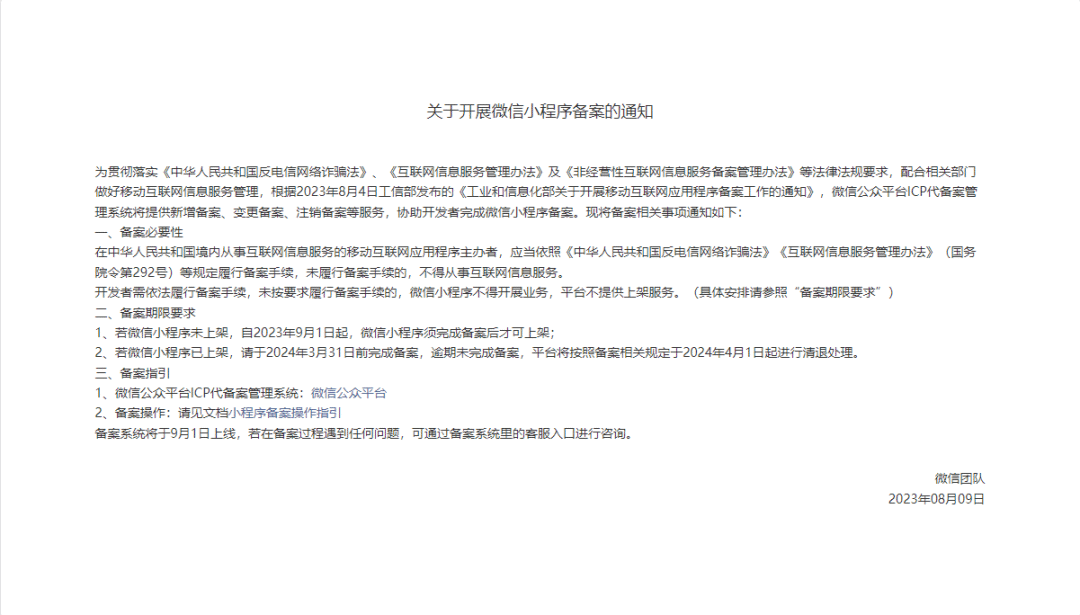 新增(未上架)小程序于9月4日开放备案入口